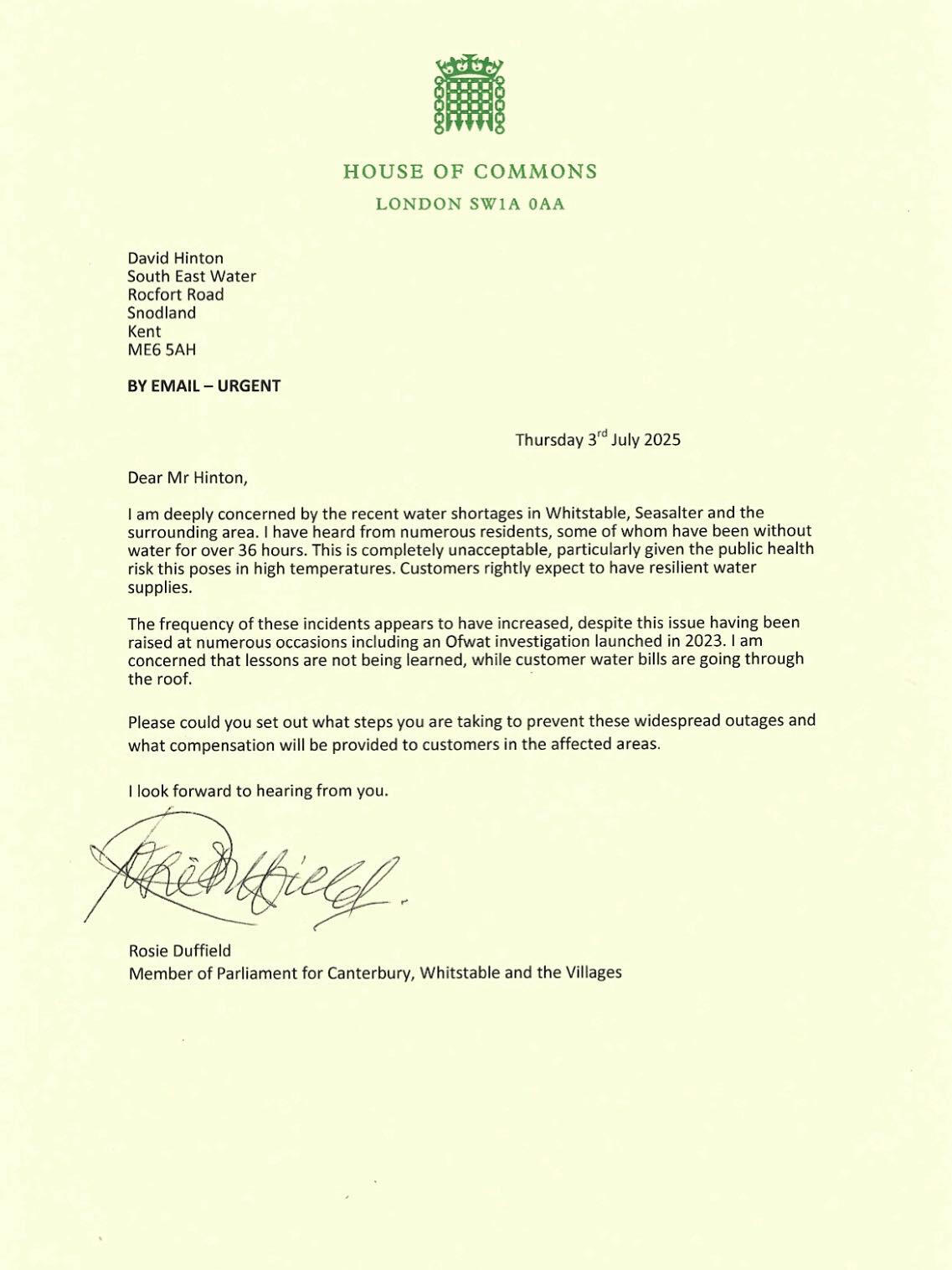 This was in July 2025 regarding the unacceptable water shortages in Whitstable, Seasalter and surrounding areas.She said "my team are here to support you. If you have any ongoing issues with your water supply, please get in touch."Thanks Rosie!