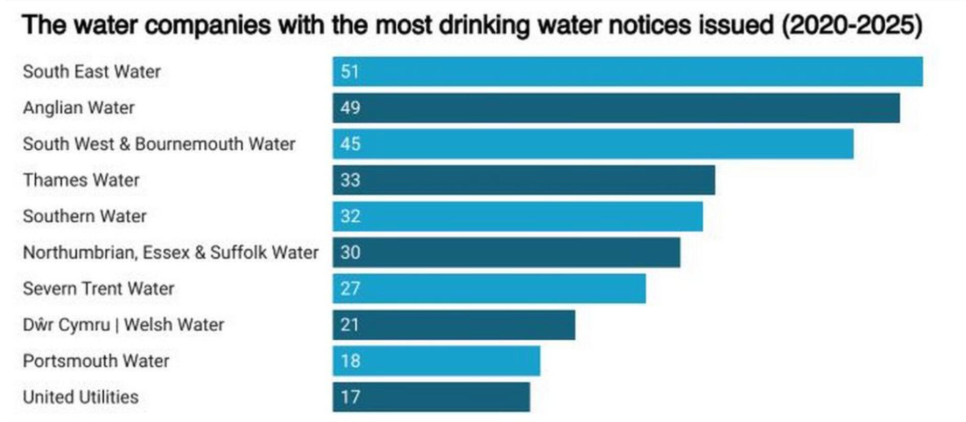 Between the financial years 2020 to 2025, 51 notices were served on SEW by the DWI on behalf of the Secretary of State, including one relating to Pembury Treatment Works. The DWI website shows SEW sent a report in September 2024 to the DWI, stating there was or had been "a significant risk of supplying water from Pembury water treatment works, and associated assets as applicable, that could constitute a potential danger to human health or could be unwholesome". source