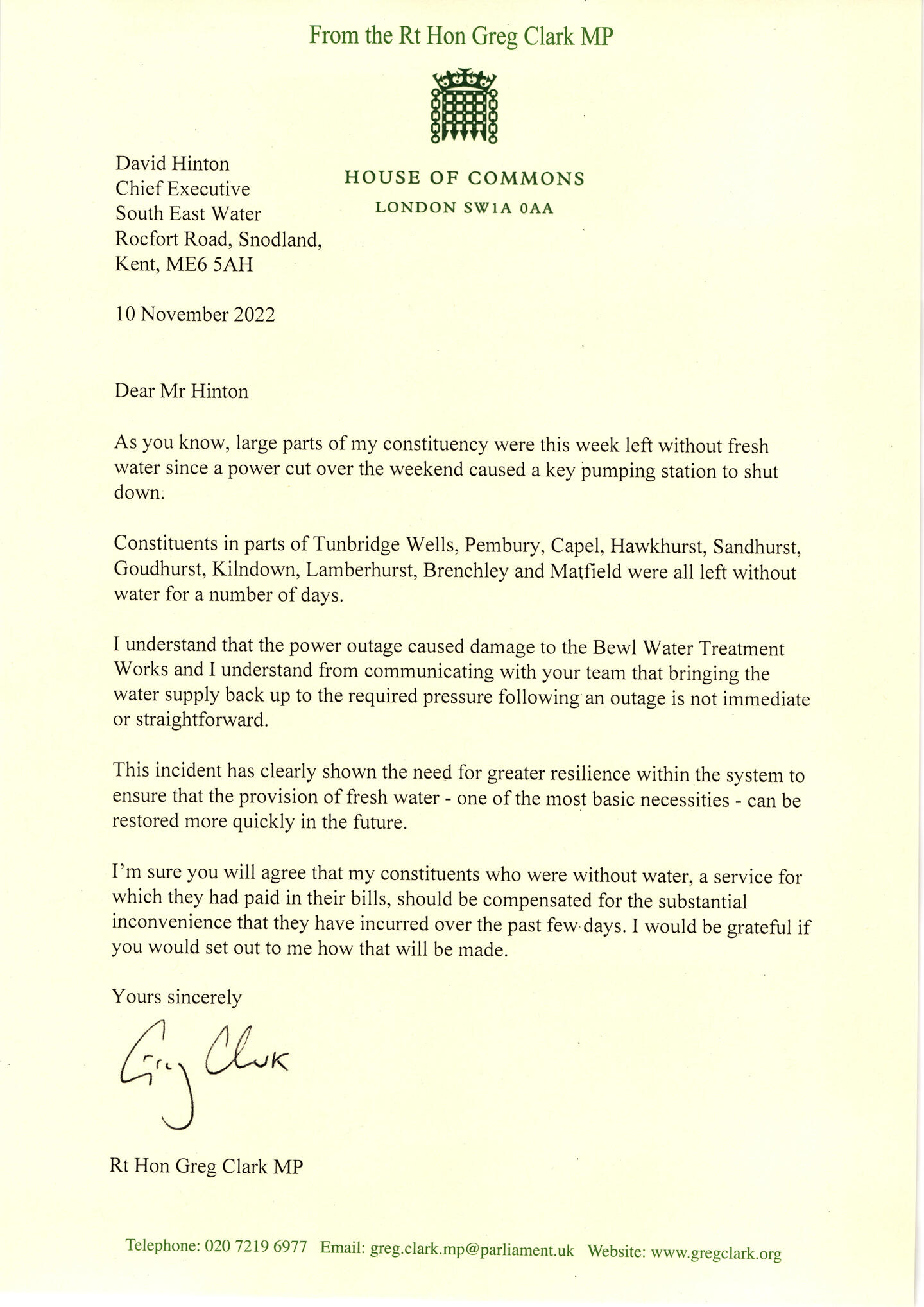 Tunbridge Wells MP Mike Martin speaking on the December water crisis.
